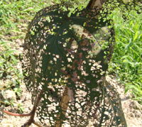 若蟲或成蟲用嘴刺吸汁液,使葉片出現(xiàn)淡白色斑點(diǎn),危害嚴(yán)重時(shí)斑點(diǎn)呈斑塊狀,或刺傷表皮,使枝條葉片枯萎。