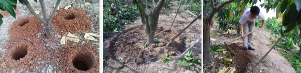 為了促進(jìn)芒果根系正常生長和再生,在不同時(shí)期應(yīng)對果園做深耕和翻土處理。冬季(或采果修剪后)應(yīng)結(jié)合深翻改土,沿樹冠垂直線下挖(60cm深、30cm寬)環(huán)溝、對溝或圓形溝,切斷土壤下層的粗根,經(jīng)曬五、六天,然后施采果肥,用表土和植物殘?bào)w加以回填。結(jié)合清園,進(jìn)行中耕翻土(20cm深),以切斷表土的吸收根,減弱地下部分對地上部分水分和養(yǎng)分輸送,有利地上部分營養(yǎng)物質(zhì)積累,促進(jìn)花芽分化。