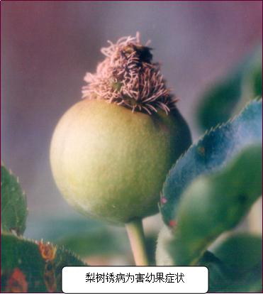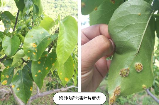 在病斑出現(xiàn)橘黃色黏液時(shí)噴施梨膠銹菌重寄生菌等,可以寄生消解梨銹病的病菌,從而逐年減輕銹病的危害。