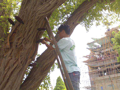 這兩棵古樹差不多有三層樓高,樹根盤枝錯(cuò)節(jié),樹體朝一側(cè)傾斜著,被工作人員用鋼管支架精心支撐住。據(jù)了解,2013年,永寧縣林業(yè)局邀請(qǐng)自治區(qū)林業(yè)廳、銀川市園林局專家對(duì)這兩棵刺槐的樹齡進(jìn)行鑒定,專家根據(jù)兩棵樹的高度、直徑,結(jié)合樹種的正常生長(zhǎng)速度進(jìn)行估算,結(jié)論是兩棵刺槐樹齡均已過百年。