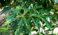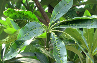 2、根據(jù)調查發(fā)現(xiàn),成蟲產(chǎn)卵期和若蟲危害期與盆架子新芽、新葉的生長期吻合,因此針對易發(fā)區(qū)域,應建議在新葉萌發(fā)期普遍噴施內吸性的農藥如崇刻(50%啶蟲脒水分散粒劑)2000-3000倍進行預防。若已經(jīng)被危害的區(qū)域,鑒于木虱危害的隱蔽性以及噴藥難以接觸蟲體的特點,建議選用內吸滲透性藥劑,且最好在葉面出現(xiàn)“包狀物”而葉背面未出現(xiàn)黑褐色羽化孔前噴霧,建議用 “必治”(稀釋1000倍)與“依它(稀釋1000倍)”混合液葉面噴施,連用2-3次,間隔5-7天噴一次; 此方案用藥前后的對比如下(見圖4、圖5)。