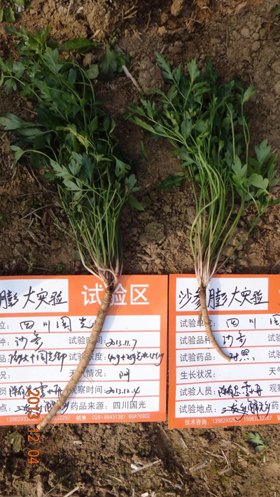 南沙參在12月開始地上部生長基本穩(wěn)定,地下根莖干物質(zhì)開始積累,根莖迅速膨大,此時正是根莖迅速膨大和積累干物質(zhì)的關(guān)鍵時期。通過有效的化學(xué)調(diào)控可以顯著的提高南沙參的產(chǎn)量和干物質(zhì)的積累。2013年12月閬中市解元鄉(xiāng)南沙參種植戶何維超使用以下化學(xué)調(diào)控技術(shù),其南沙參增產(chǎn)率達到20%以上。具體使用方法如下: