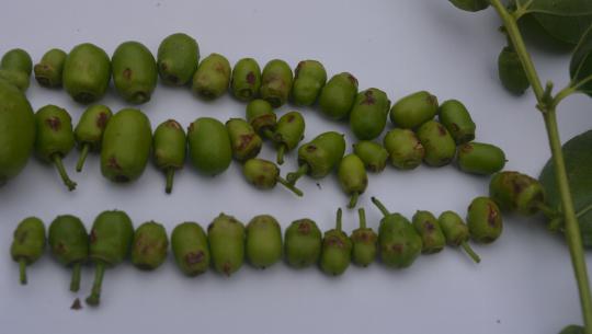 發(fā)病后期,棗吊發(fā)病部位失水,有的棗吊則出現(xiàn)斷裂,花蕾脫落。發(fā)生嚴(yán)重時花蕾較少甚至形不成花蕾,座果率顯著降低,甚至座不住果子。后期則棗吊干枯,棗吊上坐住的果實(shí),由于營養(yǎng)不良,品質(zhì)受到很大影響.
